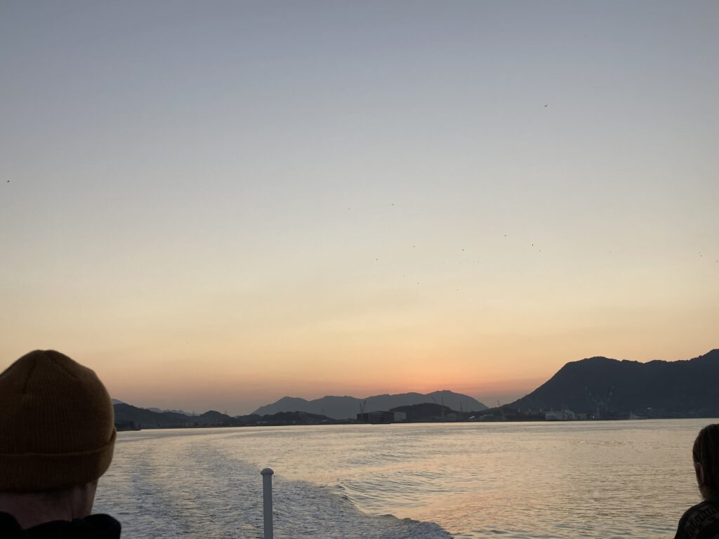オレンジ色に染まる海と、船が描く白い航跡を眺めながら、「またこの景色を見に戻ってきたいな」と心の中でそっとつぶやきつつ、今回の2泊3日の瀬戸内旅は締めくくりとなりました。