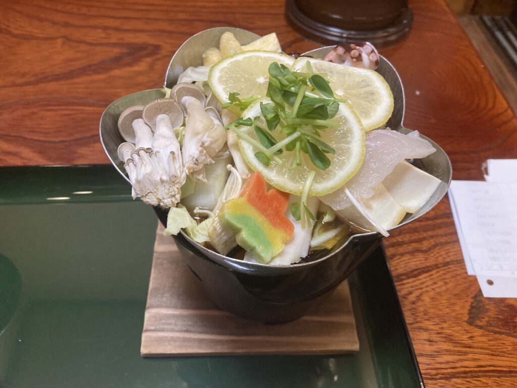 小さな鍋の中には、タコや魚介、にんじん・大根・きのこなどの野菜がたっぷり。