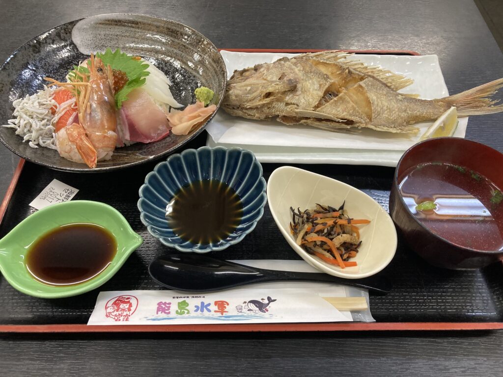 さらに、丸ごと一匹の揚げ魚がどーん!! 皮はカリッと、身はふっくらで、海鮮丼と交互に食べると箸が止まりません。ひじきの小鉢やお味噌汁もついていて、見た目以上にかなりボリューミー。